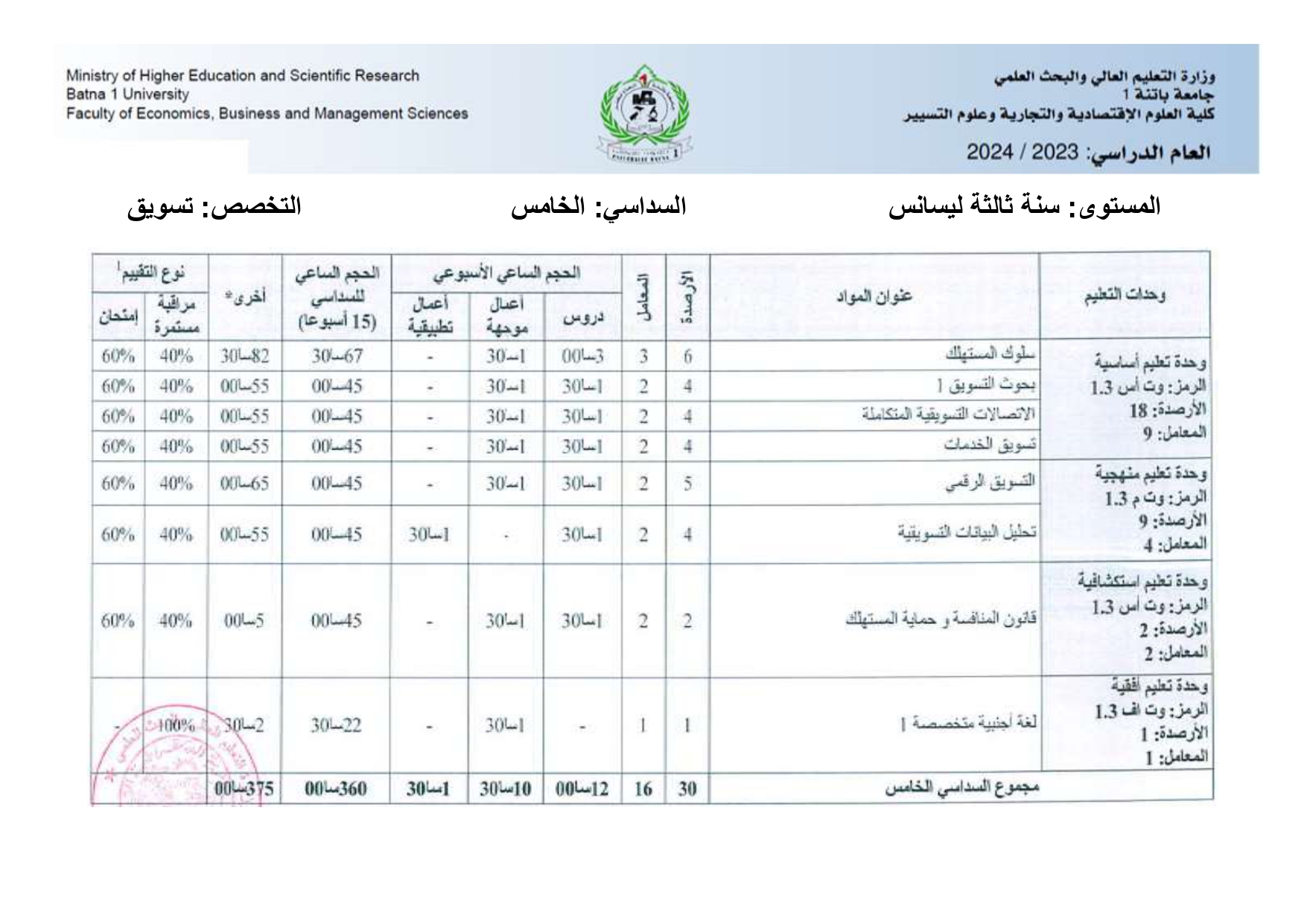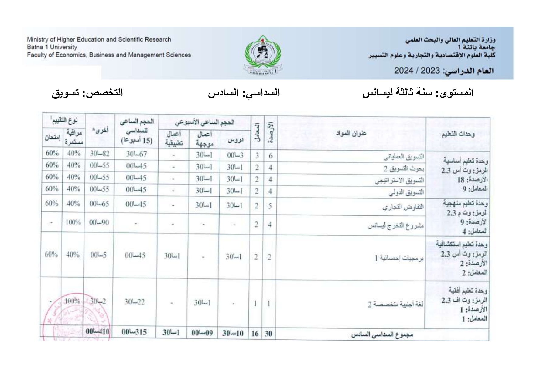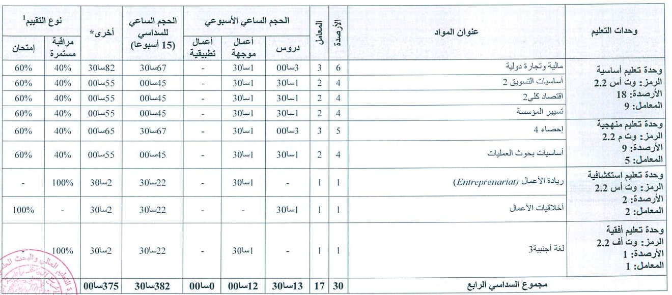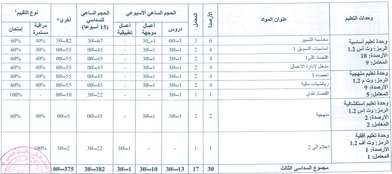 بطاقة السداسيات-قسم العلوم التجارية السنة الثانية ليسانس السداسي الثالث السداسي الرابع السنة الثالثة مالية و تجارة دولية السداسي الخامس السداسي السادس السنة الثالثة تسويق السداسي الخامس السداسي السادس السنة أولى ماستر تسويق الخدمات السداسي الأول السداسي الثاني سنة أولى ماستر مالية و تجارة دولية السداسي الأول السداسي الثاني السنة الثانية ماستر تسويق الخدمات السداسي الأول السنة الثانية ماستر مالية و تجارة دولية السداسي الثالث السداسي الرابع