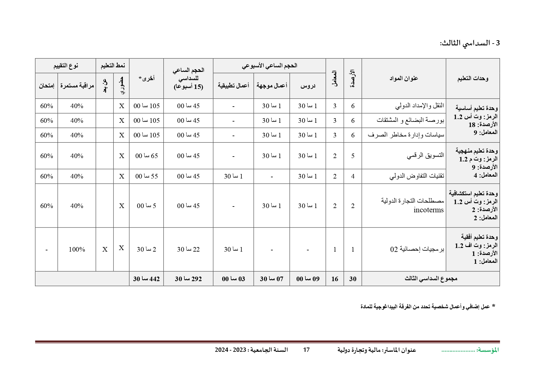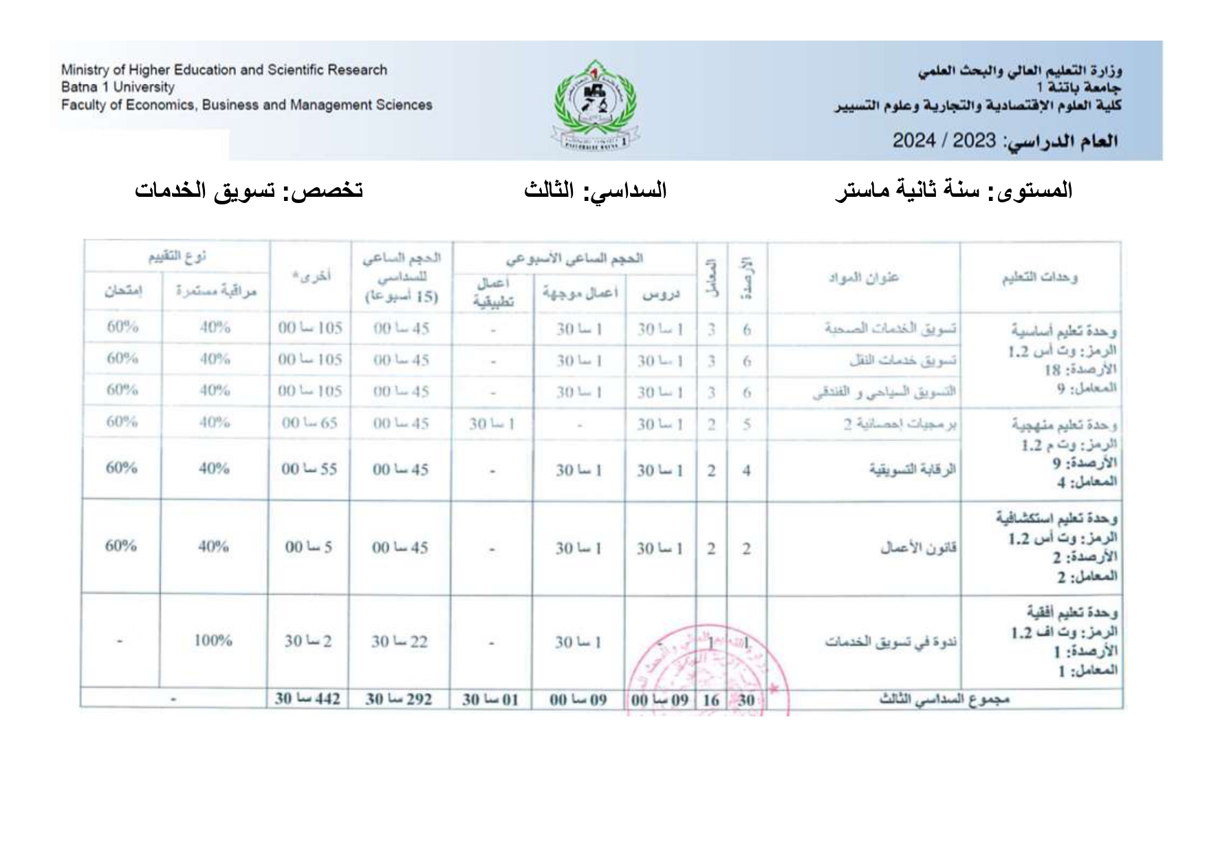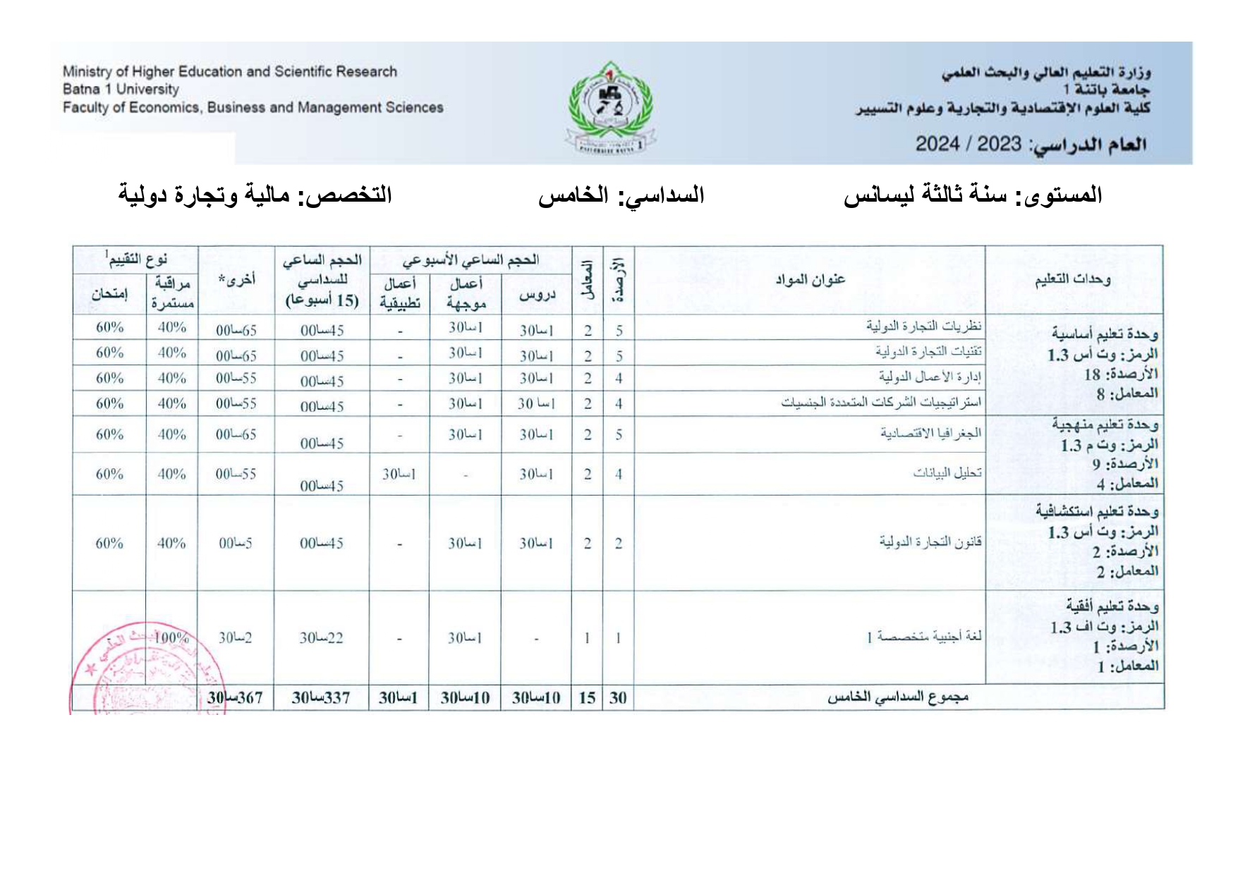 بطاقة السداسيات-قسم العلوم التجارية السنة الثانية ليسانس السداسي الثالث السداسي الرابع السنة الثالثة مالية و تجارة دولية السداسي الخامس السداسي السادس السنة الثالثة تسويق السداسي الخامس السداسي السادس السنة أولى ماستر تسويق الخدمات السداسي الأول السداسي الثاني سنة أولى ماستر مالية و تجارة دولية السداسي الأول السداسي الثاني السنة الثانية ماستر تسويق الخدمات السداسي الأول السنة الثانية ماستر مالية و تجارة دولية السداسي الثالث السداسي الرابع