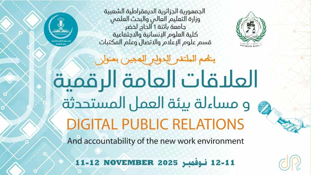 كلية العلوم الإنسانية والاجتماعية قسم علوم الإعلام والاتصال وعلم المكتبات يـنـــظــــم الملتقى الدولي الهجين بعنوان العلاقات العامة الرقمية ومساءلة بيئة العمل المستحدثة يومــــــــــــــــــي: 11-12نوفمبر 2025 ملتقى العلاقات العامة الرقمية الدكتورة همال فاطمة (PDF) قالب مداخلات ملتقى العلاقات العامة الرقمية(WORD) استمارة المشارك والسيرة الذاتية ملتقى العلاقات العامة الرقمية(WORD)