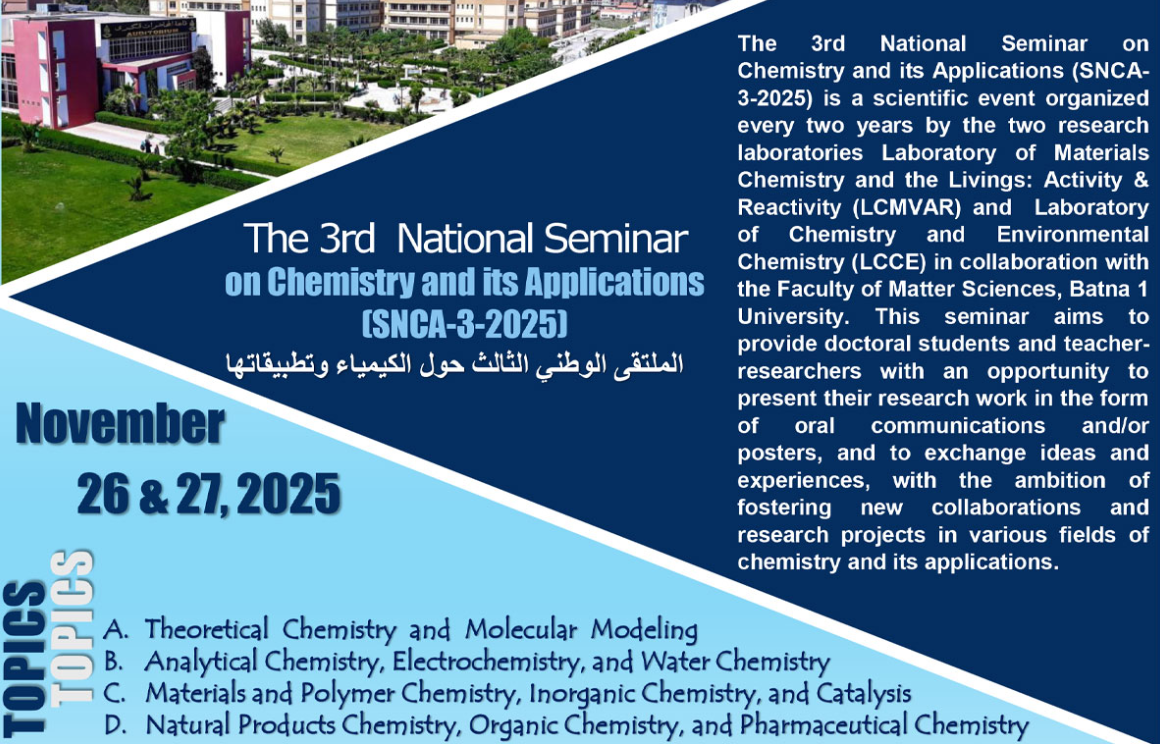 الملتقى الوطني الثالث حول الكيمياء وتطبيقاته The 3rd National Seminar on Chemistry and its Applications (SNCA-3-2025) is a scientific event held every two years, organized by two research laboratories: the Laboratory of Materials Chemistry and the Livings: Activity & Reactivity (LCMVAR) and the Laboratory of Chemistry and Environmental Chemistry (LCCE), in collaboration with the Faculty of Matter Sciences, Batna 1[…]