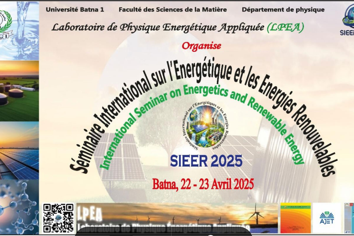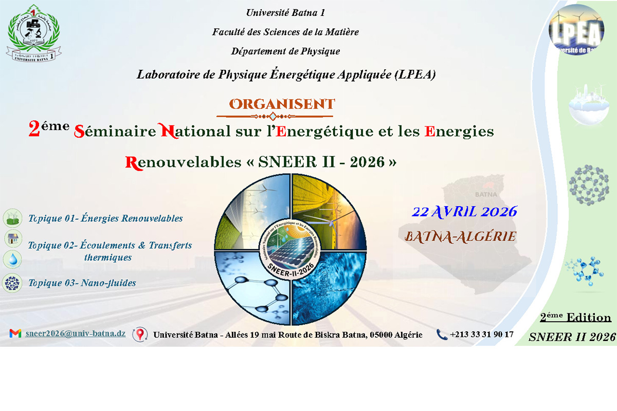 Faculté des Sciences de la Matière Département de Physique Laboratoire de Physique Énergétique Appliquée (LPEA) Organisent 2éme Séminaire National sur l’Energétique et les Energies Renouvelables SNEER II-2026 22 Avril 2026/ BATNA – Algérie